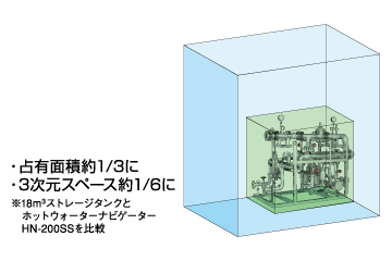 ヨシタケホットウォーターシステムは、タンクにお湯を貯めておく必要がないため、ストレージタンクシステムと比較して大きな三次元省スペースが実現できます。